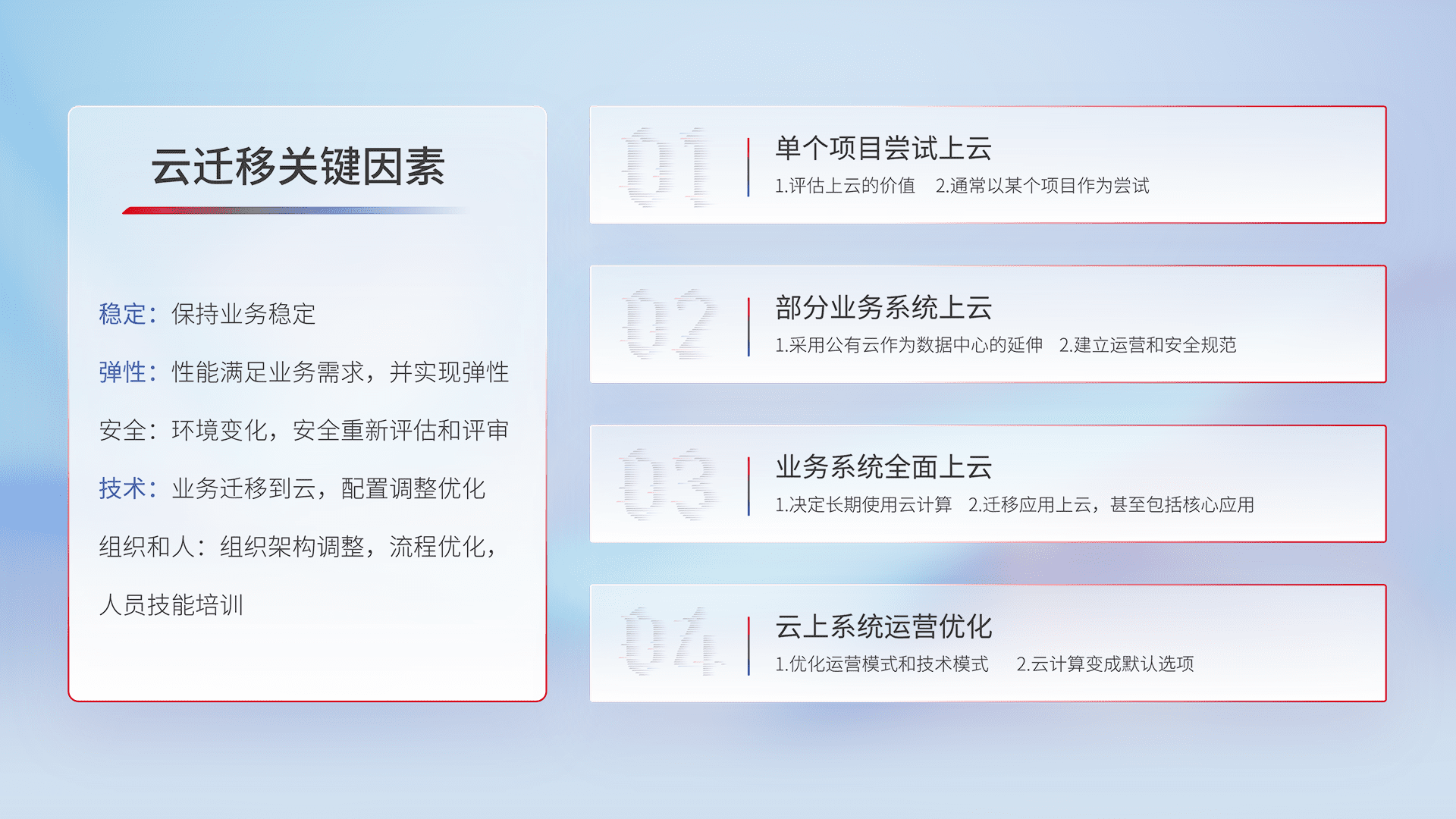 结合实际业务,,,从规划设计、、、云平台选型、、、云原生改造、、数据迁移、、、集成交付,,迁移全过程为客户识别最佳上云路径,,,,做好风险识别管理,,设计网络架构、、、、身份权限、、安全审计合规、、、操作审计、、日志审计、、、、监控告警策略、、多站点容灾设计等,,,对云上基础设施进行整体规划,,,提升IT治理水平,,,,以满足弹性、、高可用、、、、高性能的需求。。。。