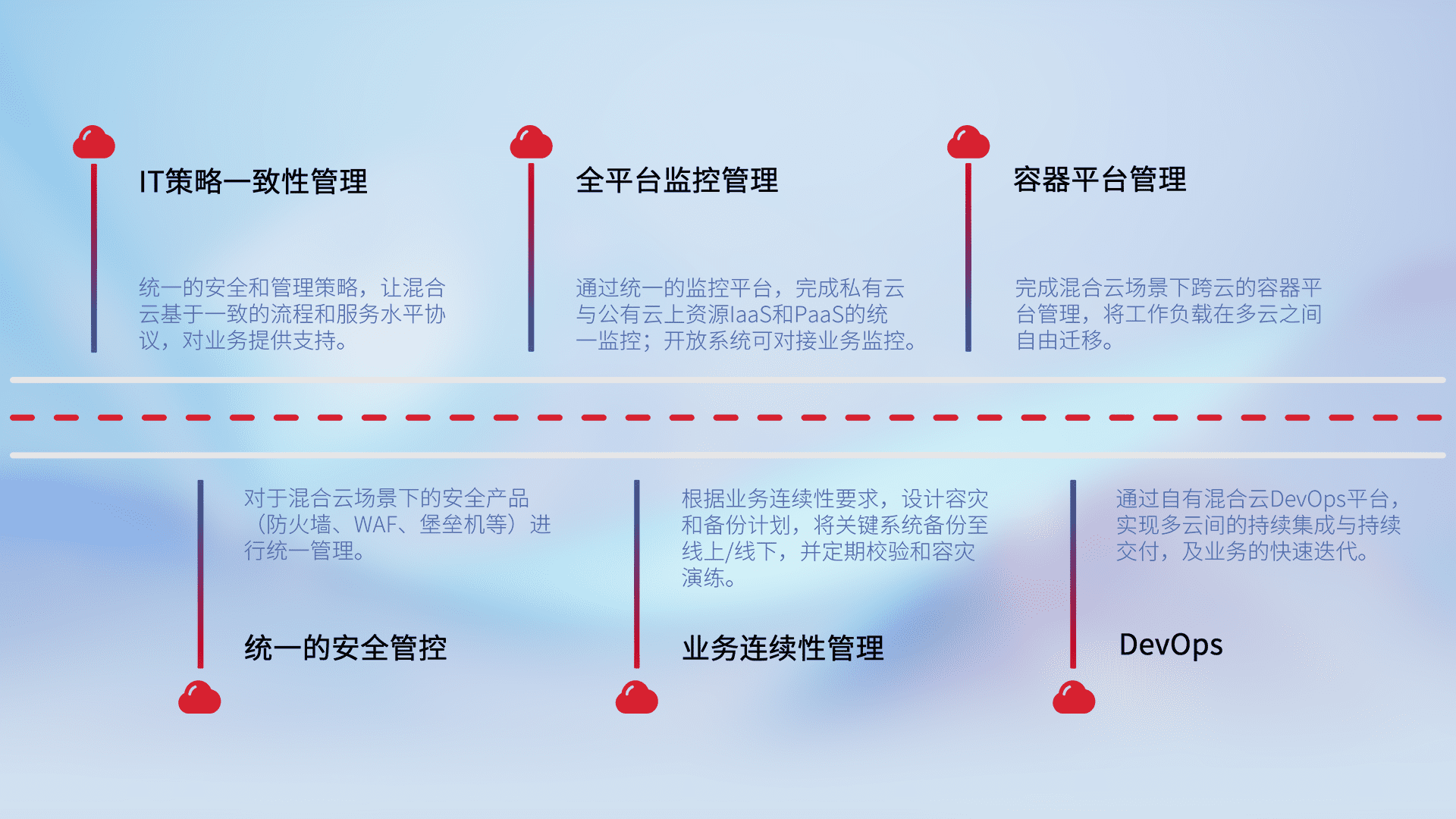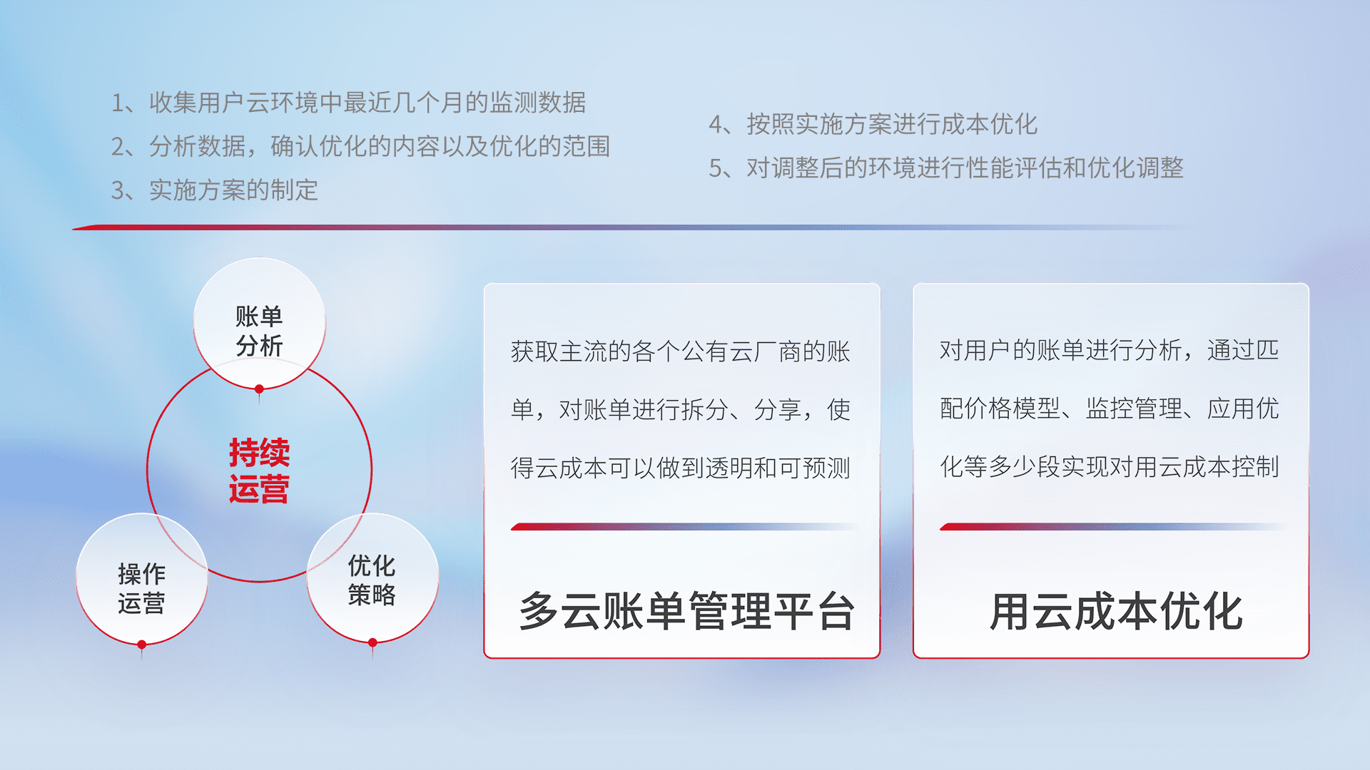 通过多云纳管,,,,以统一的资源数据模型把客户的云资源进行抽象和封装,,,,进而实现对多云资源的统一操作,,,保障云资源管理的可靠性、、、、稳定性与可用性。。。。量身定制化运维内容,,,配置、、、、开发运维、、、、补丁管理、、、、备份、、、、监控、、、认证和访问管理、、、、审计和日常巡检等,,,保障在用云过程中的可靠度,,稳定度以及高可用率。。